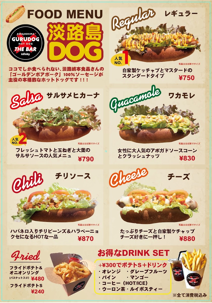 Introducing 淡路島ホットドッグGURUDOG✖️THEBAR infinity, a delightful gastronomic haven located in Minamiawaji, Hyogo. Specializing in gourmet hot dogs, this eatery features an impressive menu with standout offerings like the Regular Gurudog, crafted from 100% Awaji golden boar pork, garnished with homemade ketchup and pickled Awaji onions. Priced at just JP¥850, it perfectly marries flavor and quality.